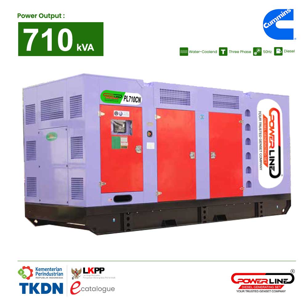 Jual Harga Genset 710 KVA Cummins KTA38-G1 (PL 710 CN) dengan Generator Powerline atau Stamford. Terdapat dua macam genset yang tersedia yaitu Tipe Open dan Tipe Silent dengan harga genset murah, berkualitas dan bergaransi. Seluruh Genset POWERLINE menggunakan 100% GENUINE Engine dan Generator. Dan masih didukung oleh Teknisi berpengalaman untuk tim after sales kami, memastikan genset bisa beroperasi dengan baik.